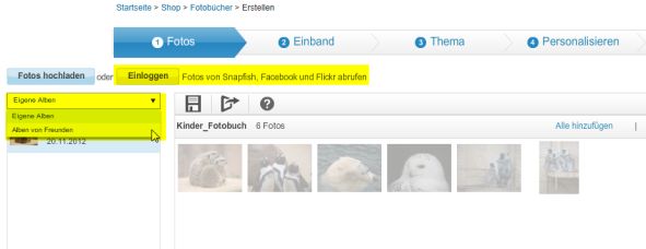 Hier kann man nun auch Alben von Freunden einsehen und offenbar auch für eigene Werke verwenden. Außerdem ist ein Zugriff auf die Fotos bei Facebook und Flickr möglich. Für mein Projekt ist beides nicht nötig, aber grundsätzlich finde ich das eine sehr gute Idee. Gerade zu Weihnachten erstellen ich mit meinen Geschwistern öfter Fotokalender für die Eltern und da ist es schon sehr praktisch, wenn jeder seine Bilder direkt hochladen und einer dann aus den verschiedenen Quellen bequem den Kalender zusammenstellen kann.