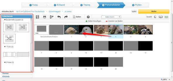 Alternativ zur eigenen Gestaltung stehen am linken Bildrand vorgefertigte Layoutschablonen zur Auswahl. Bei meinem Mini-Fotobuch ist das Angebot jedoch sehr dünn. Wie ich eine neue Bildbox hinzufügen kann, finde ich zunächst nicht heraus. Es gibt jedenfalls keinen Button dafür.