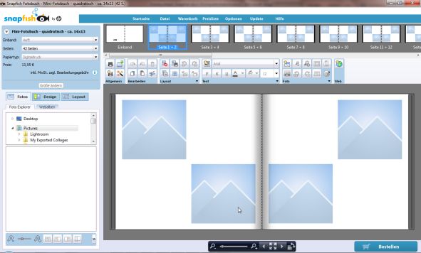 "Snapfish bietet je nach Buchtyp die Online-Erstellung oder die Software zum Herunterladen an. Bei Echtfoto-Büchern wird grundsätzlich die Software angeboten, für Produkte im Digitaldruck führt der Link zur Bucherstellung zur Online-Software. Digitaldrucke können aber auch mit der Software erstellt werden. Der Link zum Download wird dort jedoch nicht angeboten. Man kann sich aber einfach behelfen, indem man den von den Echtfotobüchern nimmt. Mit der Software hat man deutlich mehr Gestaltungsmöglichkeiten als bei der Online-Anwendung. Bei dem Programm handelt es sich um eine für Snapfish angepasste Version des bekannten Fotobuch-Editors von
